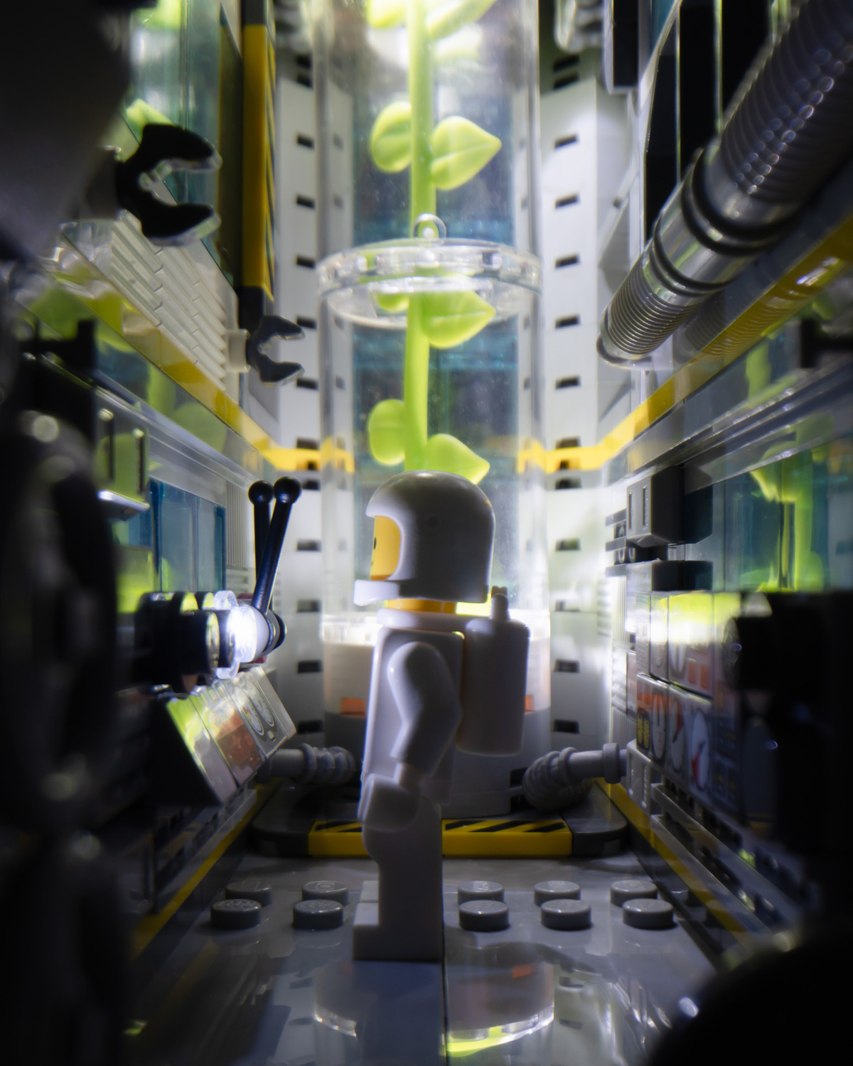 Space Botany Lab shows that philosophy in full. A translucent cylinder glows green. A tiny button emits light just strong enough to pull the figure’s gaze. Illumination pours through panels from both sides, layered and intentional. It looks complex because it is — a composition of practical lights and external sources working together to create depth at a miniature scale.